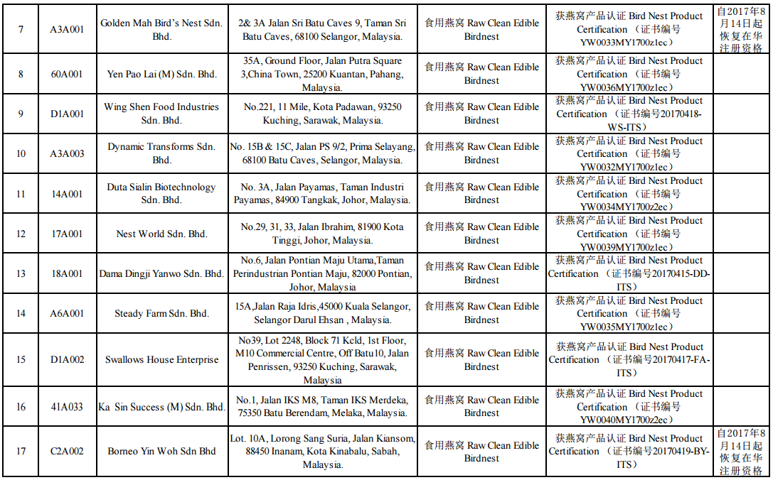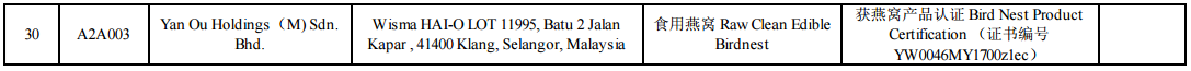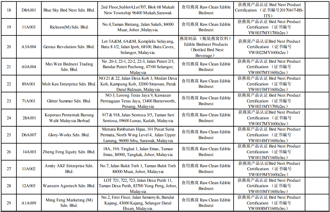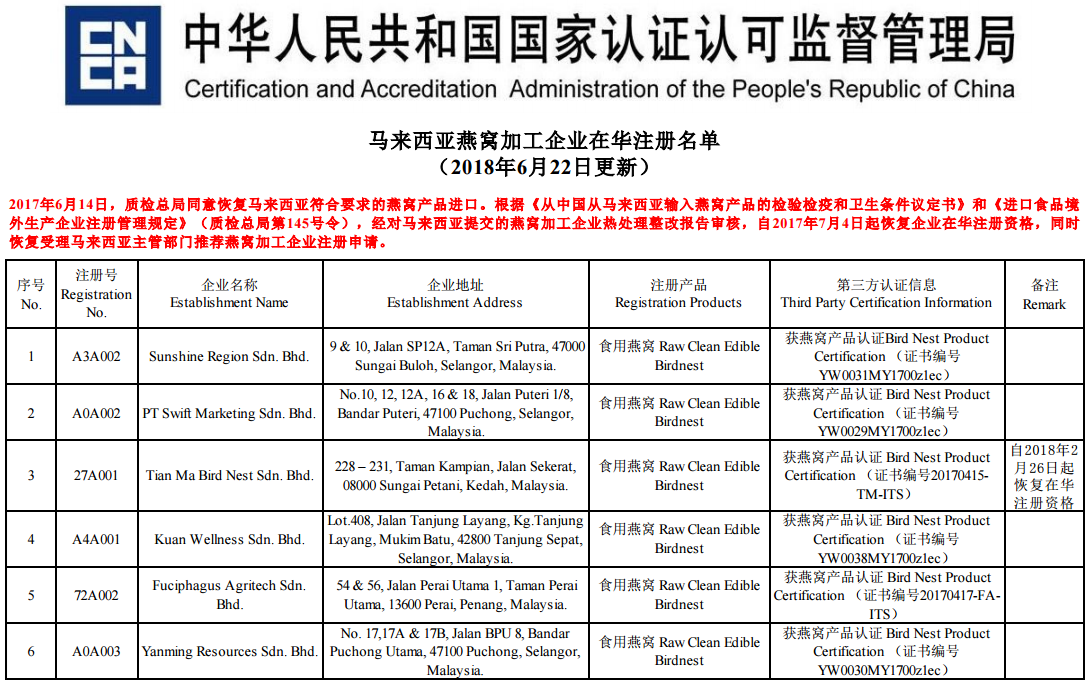 马来西亚燕窝加工企业在华注册名单(2018年6月22日更新)