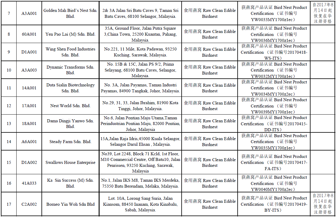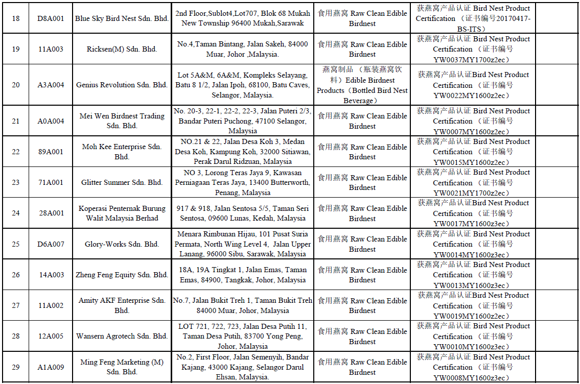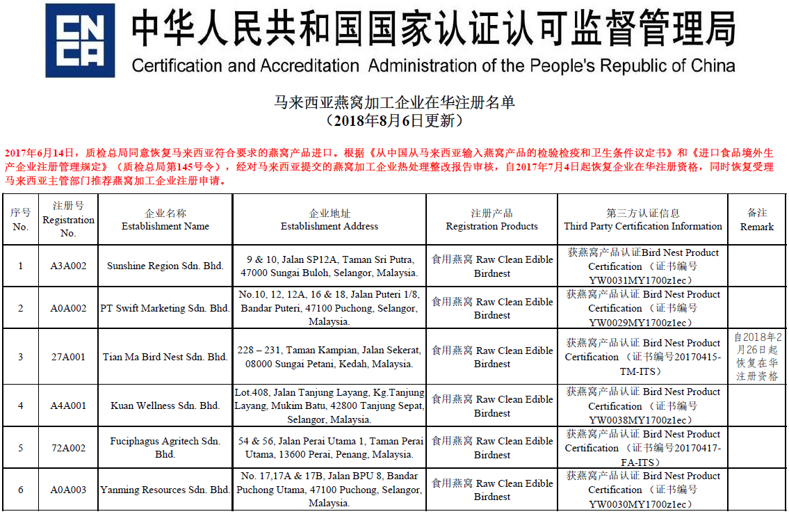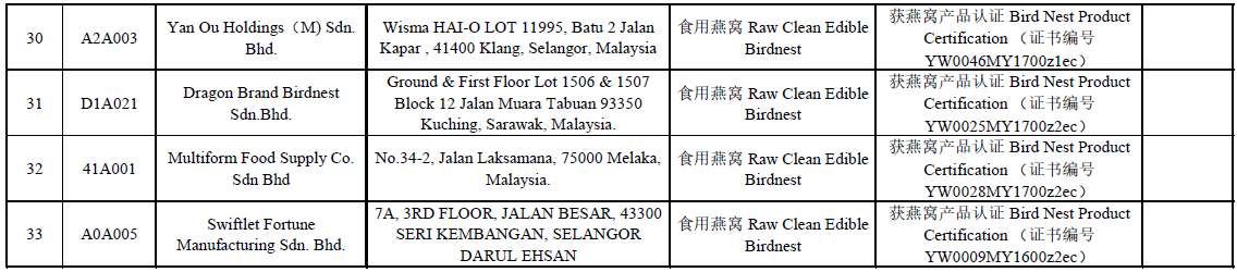 近日,国家认证认可监督管理局发布了最新的马来西亚燕窝加工企业在华注册名单,其公司数目已增加到33个,具体详情如下: